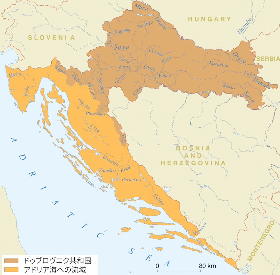 国土の38%を占めているアドリア海に流れ込む流域では、地勢の大部分が石灰岩から形成されているために、水路網の多様性は少なく、川は豊富な水源から湧き出ており、その勾配は急で全長は短い。大きな川と言えば、ミルナ川、ズルマニャ川、クルカ川、ツェティナ川、そして最大のネレトヴァ川があるが、そのうち20 kmしかクロアチアを通っておらず、その部分のみが航行可能である。リカ川とガツカ川のカルスト地下河川もアドリア海に流れ込む。