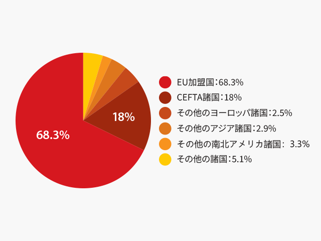 輸出では製造業が最も大きく、全体の81%を占める。2021年の最大の輸出は、機械と輸送機器(22%)、食品(9.5%)、電気機器(8%)、金属製品(8%)、化学製品(6.9%)、医薬品(6.6%)、コークスと石油製品(5%)、木材・木材製品(5.9%)、金属(5.2%)、衣料品(4.6%)、ゴム・プラスチック製品(4%)、鉱産品(3.9%)、コンピュータとコンピュータ装置(3.7%)、皮革(2.8%)、紙(2.3%)、家具(1.8%)、繊維製品(1.2%)、飲料(1.1%)、そしてタバコ(1.0%)であった。
