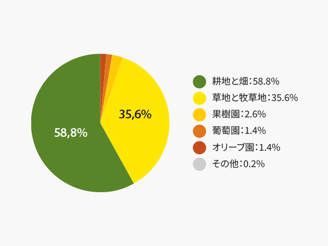クロアチアには150万ヘクタールの利用可能な農地があり、そのうち約90万ヘクタールが耕地と畑であり、その他は野菜畑、果樹園、オリーブ園、葡萄畑、牧草地に相当する。気候、地勢、土壌の違いの恩恵により、普通作物と工芸作物から内陸や地中海の果物や野菜まで、幅広い農産物を生産できる。耕作は穀物、油糧作物と砂糖の国内需要を満たし、工芸作物の需要の大部分もカバーしている。クロアチアはワイン生産国であり、内陸と地中海葡萄の種類の両方が栽培されており、在来品種も有する。葡萄畑は20,000ヘクタールに伸びており、2023年には612,000ヘクトリットルのワインが生産された(2022年には725,000ヘクトリットルであった)。