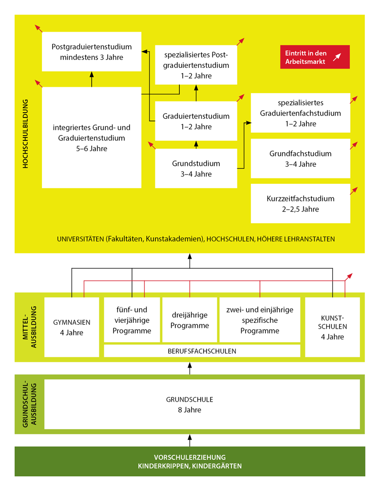 Im Alter von sechseinhalb Jahren beginnen Kinder mit ihrer Pflichtschulbildung, die 8 Jahre dauert. Für diejenigen, die älter als 15 sind und die Grundschule nicht abgeschlossen haben, steht das System der grundschulischen Erwachsenenbildung zur Verfügung.