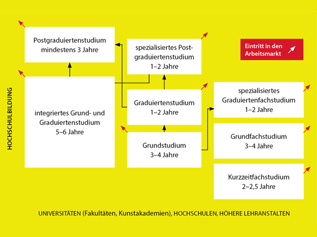 Die Hochschulbildung findet an den Hochschuleinrichtungen im Rahmen der universitären und fachhochschulischen Studiengängen statt. Die Hochschuleinrichtungen sind in Fachhochschulen, Hochschulen für angewandte Wissenschaften, Fakultäten und Kunstakademien unterteilt. Bis 2005 wurden alle Studienprogramme mit den Anforderungen des Bologna-Prozesses zur Schaffung eines gemeinsamen Europäischen Hochschulsystems abgestimmt.
