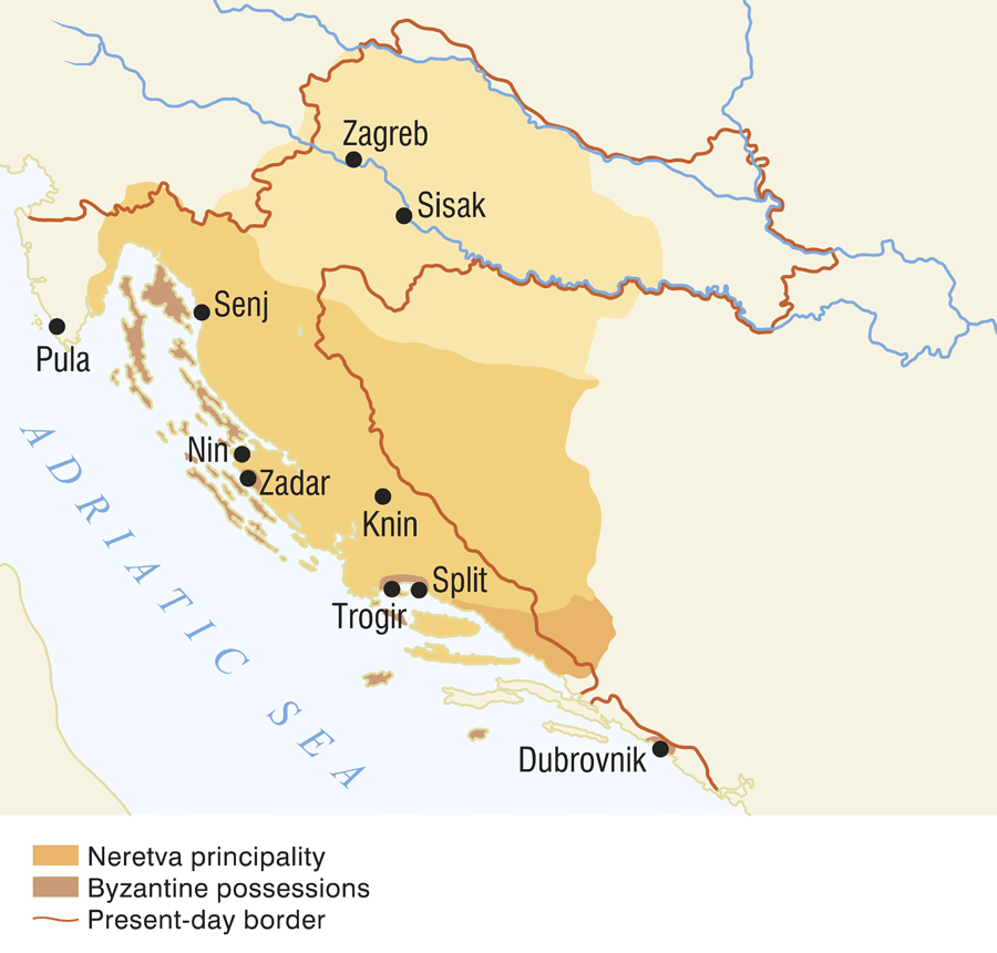 Gegen Ende des 8. Jahrhunderts und Anfang des 9. Jahrhunderts fügten sich die Kroaten der Oberherrschaft des fränkischen Herrschers Karl I. des Großen und waren in zwei große Grenzfürstentümer (Marken) eingeteilt, in denen einheimische Fürsten herrschten. Im Küstengebiet und im gebirgigen (südlichen) Hinterlanddes heutigen Kroatien wurde das Fürstentum Dalmatinisch-Kroatien mit Sitz unweit von Knin gegründet und auf dem Territorium des (nördlichen) Tieflandes das Fürstentum Unterpannonien (Pannonisches Kroatien, später Slawonien) mit Sitz in Sisak.