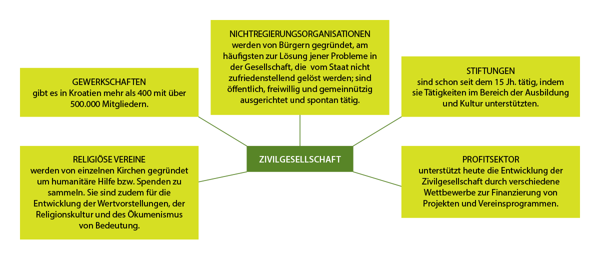 Wegen der Kriegsaggression gegen Kroatien und der dadurch verursachten ungünstigen wirtschaftlichen, politischen und kulturellen Bedingungen, entwickelte sich seit den frühen 1990er Jahren die Zivilgesellschaft erst langsam, und kann deswegen systematisch erst ab der Verabschiedung des allgemeinen Vereinsgesetzes in 1997 und der Gründung der Nationalstiftung zur Entwicklung der Zivilgesellschaft in 2003 verfolgt werden.