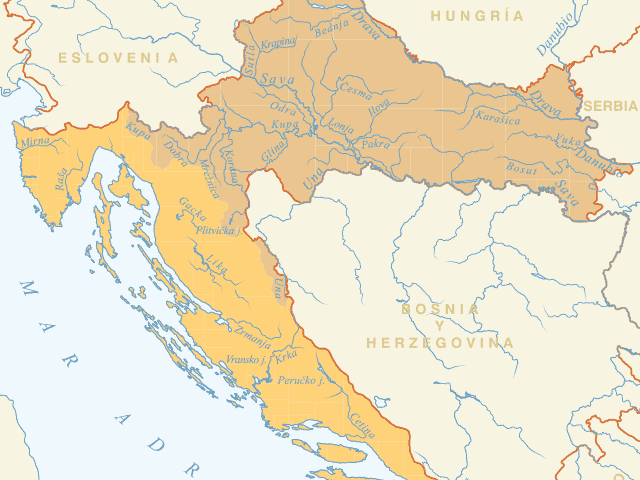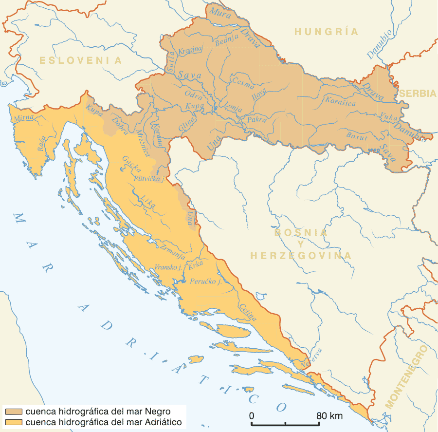 Alrededor de un 62% del territorio cubierto por una amplia red fluvial pertenece a la cuenca del Mar Negro. A esa cuenca pertenecen los ríos croatas más largos, el río Sava (562 km) y el río Drava (505 km), que, igual que el Danubio al que afluyen, son en gran parte ríos que representan fronteras naturales.