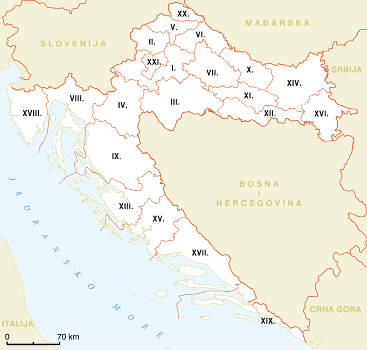 Županija kao jedinica teritorijalne podjele u Hrvatskoj ima dugačku tradiciju. Spominje se od 10. st., isprva u južnom dijelu zemlje, a potom i u sjevernom. U različitu broju te s promjenjivim teritorijalnim opsegom, načinom ustroja i ovlastima, održale su se do 20. st. Razvojačenjem Vojne granice (1881) na području Kraljevina Hrvatske i Slavonije 1886. utemeljeno je osam županija: Modruško-riječka, Ličko-krbavska, Zagrebačka, Varaždinska, Bjelovarsko-križevačka, Požeška, Virovitička i Srijemska. Promjenom upravno-teritorijalne podjele ponovo je uvedena 1990. kao jedinica regionalne samouprave.