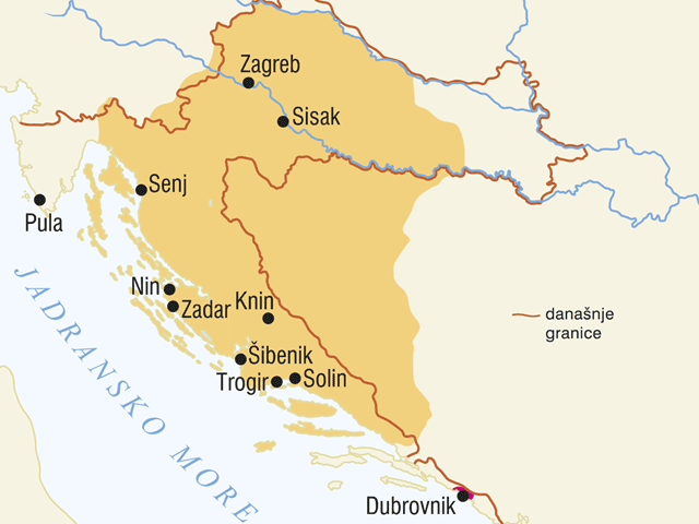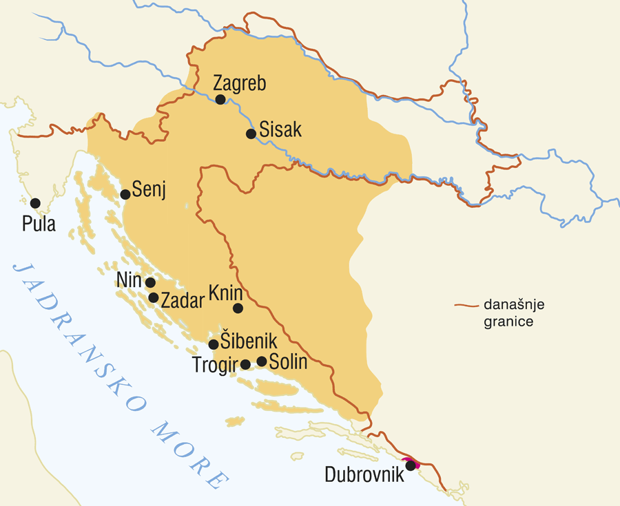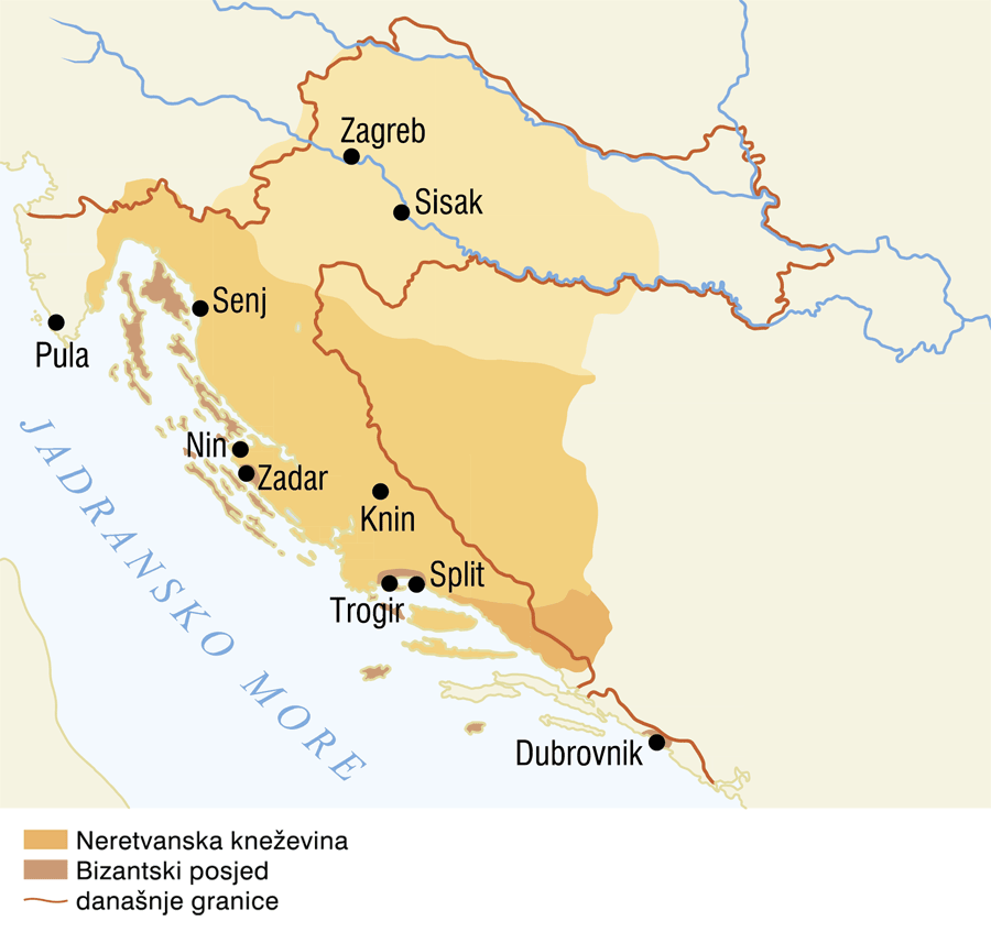 Natpis iz Šopota kraj Benkovca s imenom kneza Branimira, kojega je 879. papa Ivan VIII. priznao za hrvatskoga vladara (vladao do smrti oko 892), a Hrvatsku za neovisnu državu.Jelena (?–976). Hrvatska kraljica, supruga kralja Mihajla Krešimira II. (vladao 950–969) i majka kralja Držislava Stjepana (vladao 969–997). Na njezinoj nadgrobnoj ploči, otkrivenoj 1898, zabilježeni su vladarski naslov rex i genealoški podatci o dinastiji Trpimirovića.Hrvatske kneževine u 9. st.