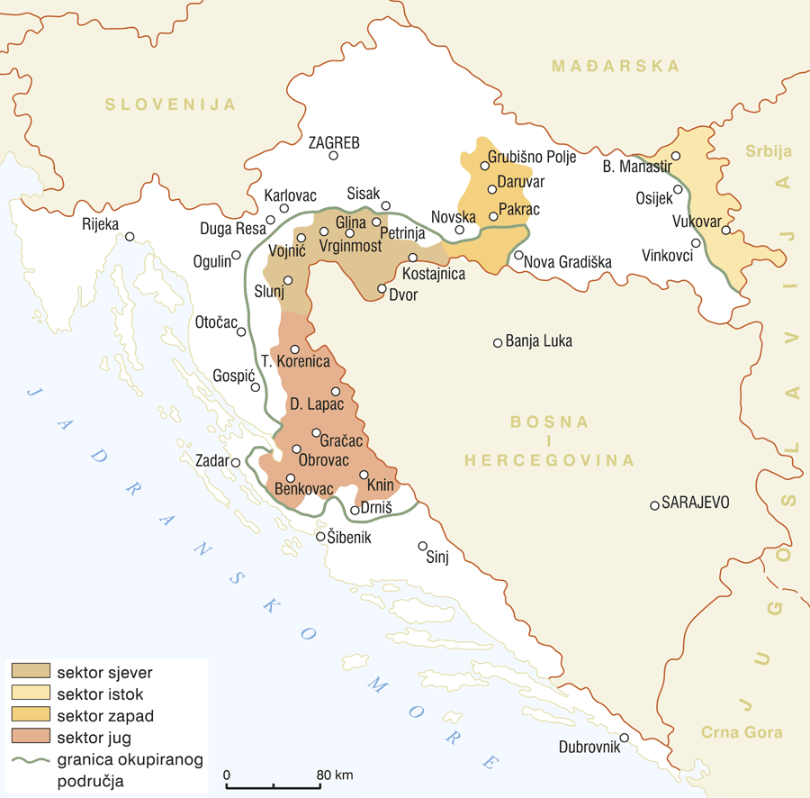 Nakon petnaestak pokušaja sporazumno je primirje između hrvatskih snaga i JNA postignuto 2. I. 1992. Na taj je način omogućena mirovna operacija UN-a u Hrvatskoj. Na pobunjenim područjima i nekim susjednim dijelovima zahvaćenima sukobima uspostavljene su Zaštićene zone UN-a (UNPA – UN Protection Areas) pod zaštitom UN-ovih mirovnih snaga (UNPROFOR – UN Protection Force), uz dodatni pojas koji se trebao razvojačiti (tzv. ružičaste zone). JNA se povlači iz Hrvatske te strateški podupire srpske snage u BiH, u kojoj rat započinje početkom travnja 1992. Taj rat dodatno je zakomplicirao geopolitičke i strateške okolnosti u kojima je Hrvatska branila neovisnost, jer su pobunjeni Srbi u Hrvatskoj usklađivali ratno djelovanje sa srpskim snagama u BiH, a u političkom smislu sa samoproglašenom Republikom Srpskom.
